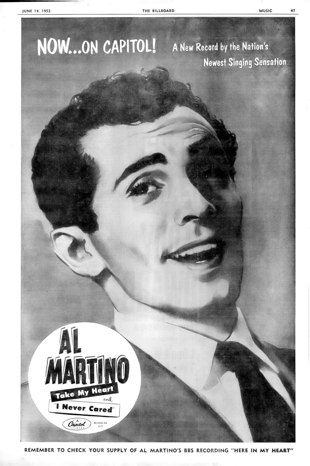 As a result, he won a recording contract with the Philadelphia-based independent record label BBS, where he recorded "Here in My Heart." Lanza's label RCA Victor had asked him to record the song, but Martino called and pleaded with him to let Martino's version have a clear run.[1][2] The song spent three weeks at No. 1 on the US pop charts in June 1952, earning Martino a gold disc,[7] and later in the year, also reached the top of the UK charts. It was number one in the first UK Singles chart, published by the New Musical Express on November 14, 1952, putting him into the Guinness Book of World Records.[8] "Here in My Heart" remained in the top position for nine weeks in the UK, a record for the longest consecutive run at number one, that has only since been beaten by five other songs.[9][10]